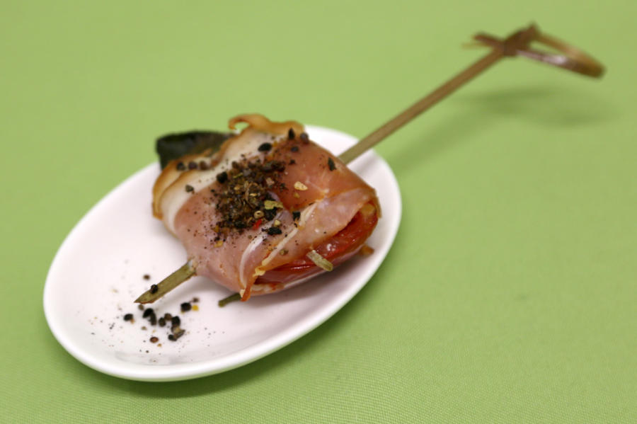 Saltimbocca von gegrillter Tomate, in Schinken und Salbeiblatt gewickelt