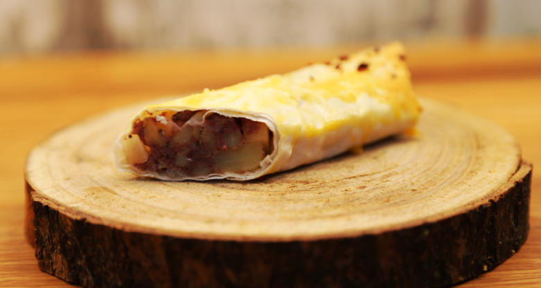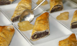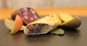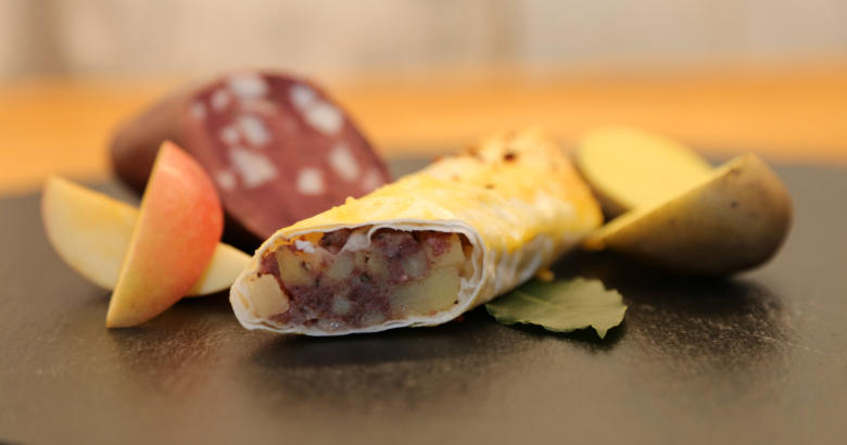 kandierten Öllich un Äpfeln en Börrekteig jewickelt