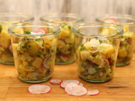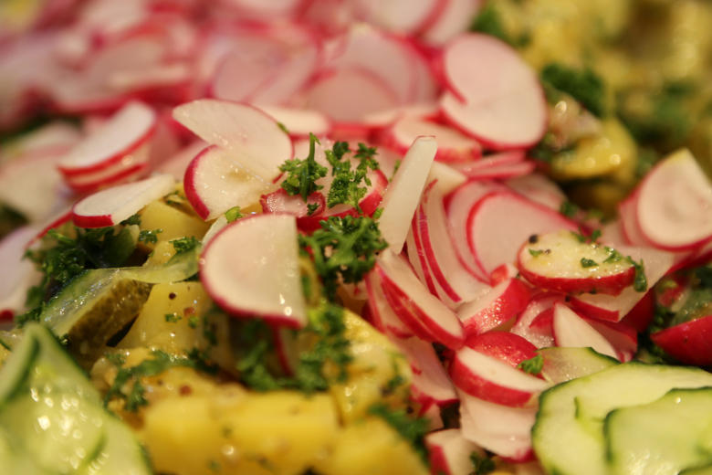 Rheinischer-Kartoffelsalat „ohne Mayo“, doför met Weißweinessig,