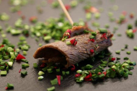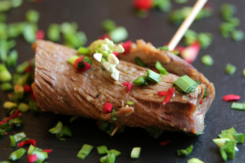 Leckeres gekochtes Stöck vum Rind, jerollt, jespießt, opjelaht un met