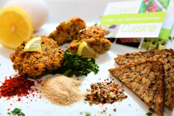 Backes. Jeht och met gegrillten Pilzen en ener Soja-Sahne-Soß.